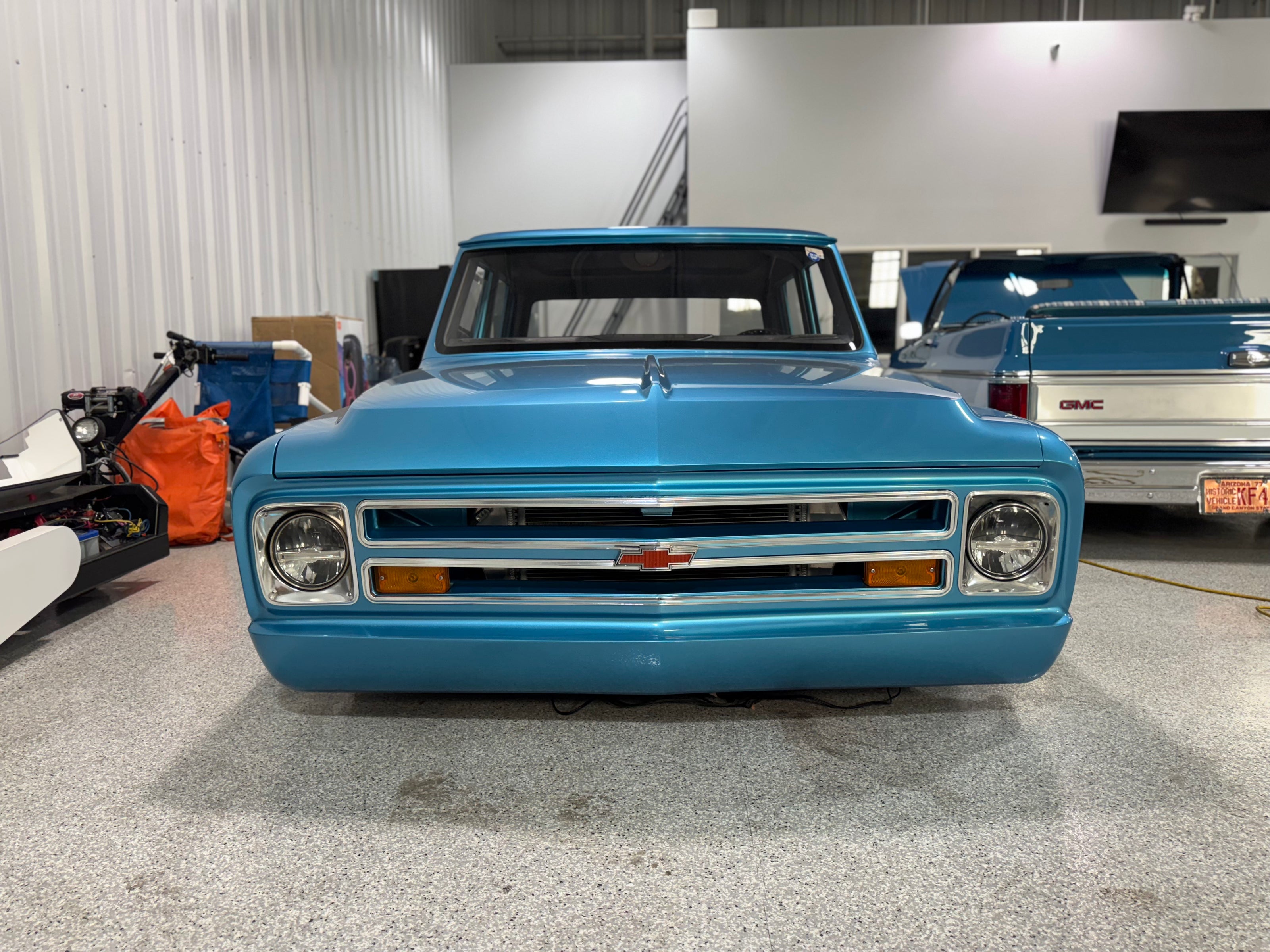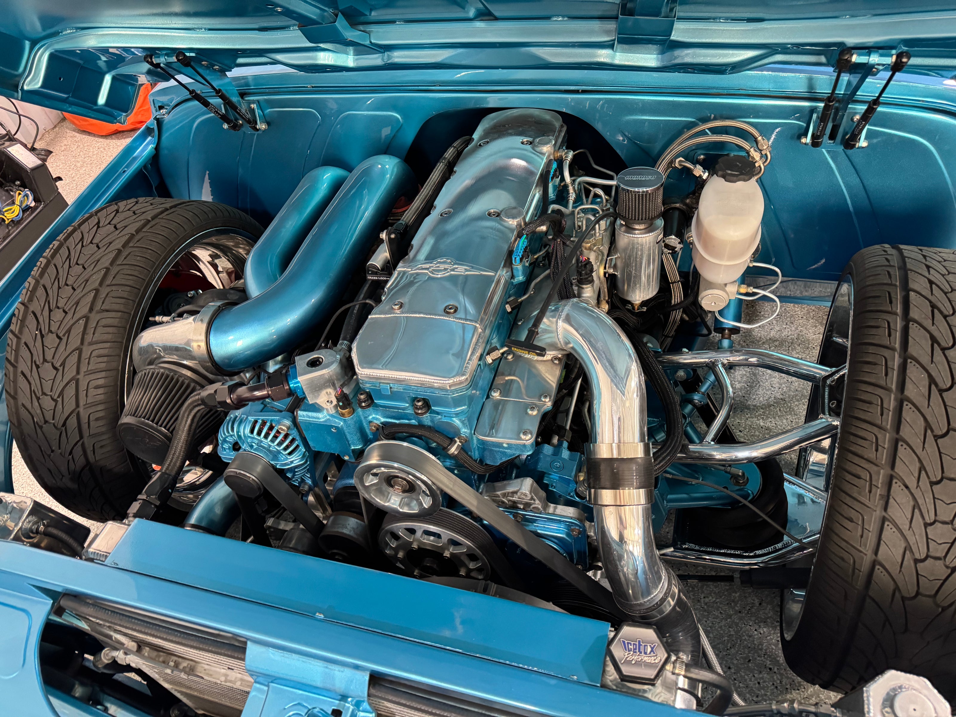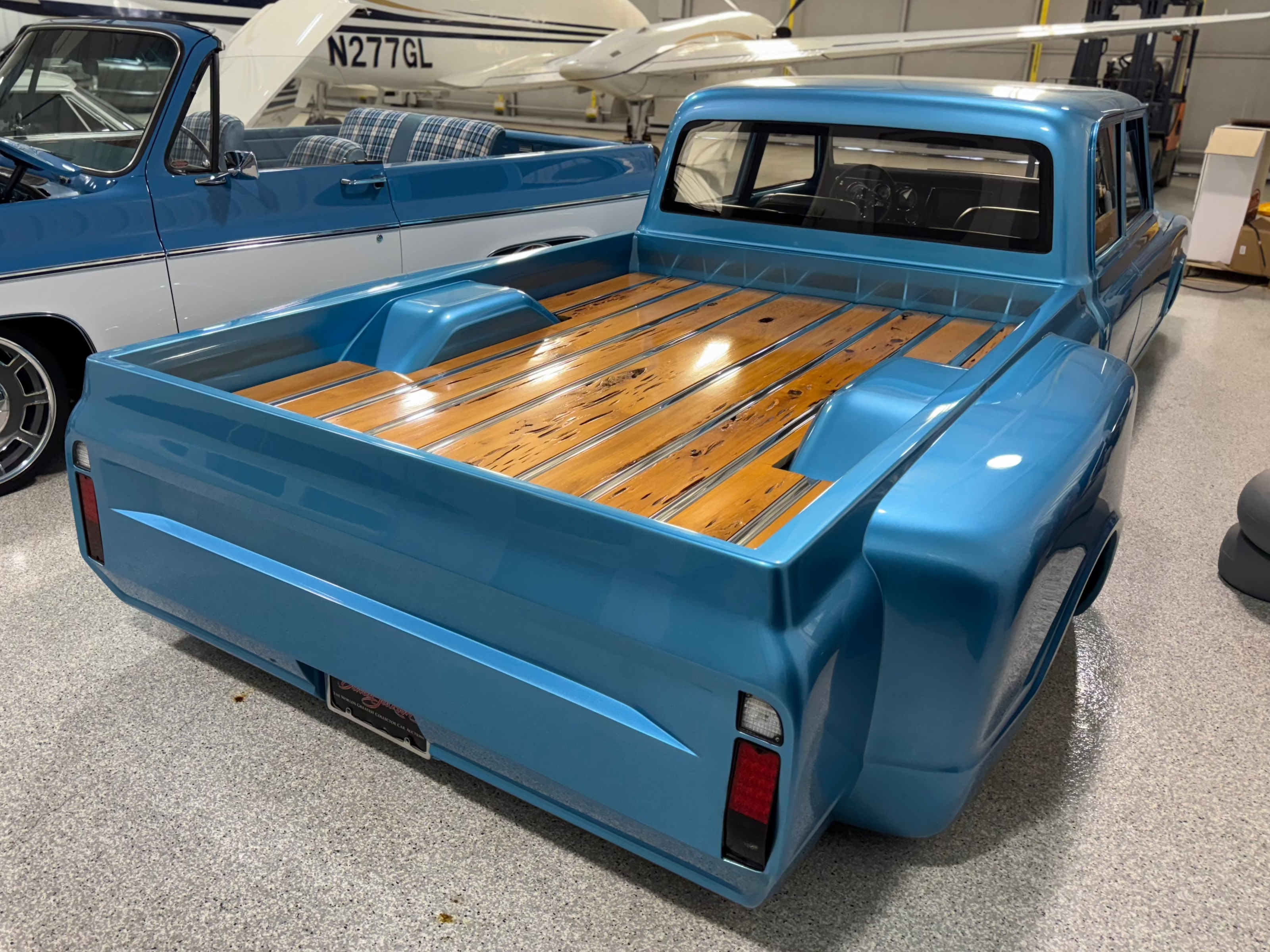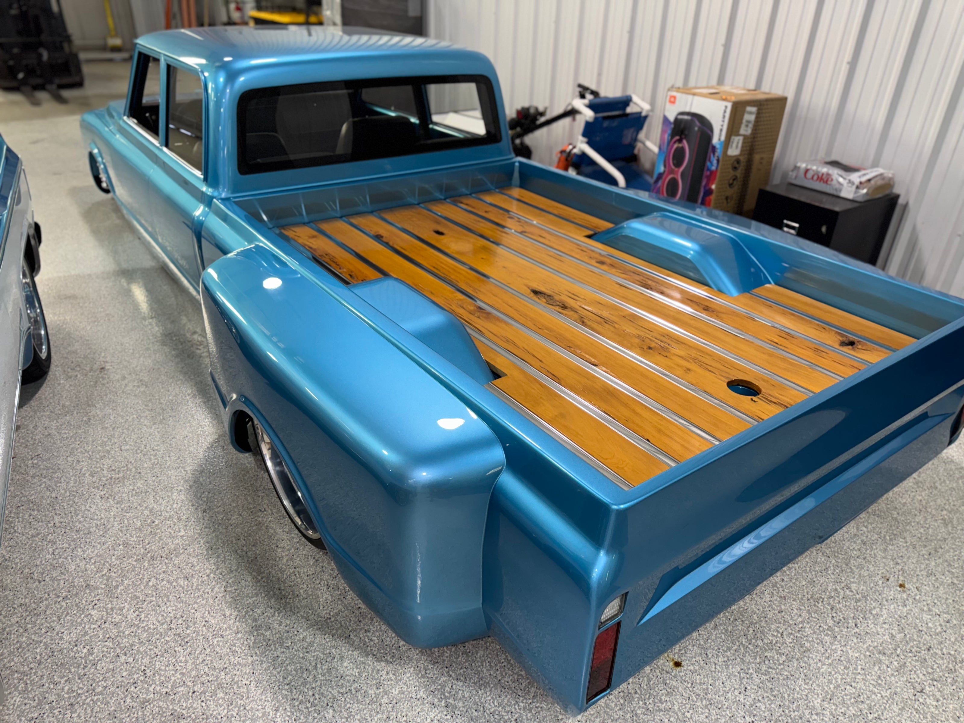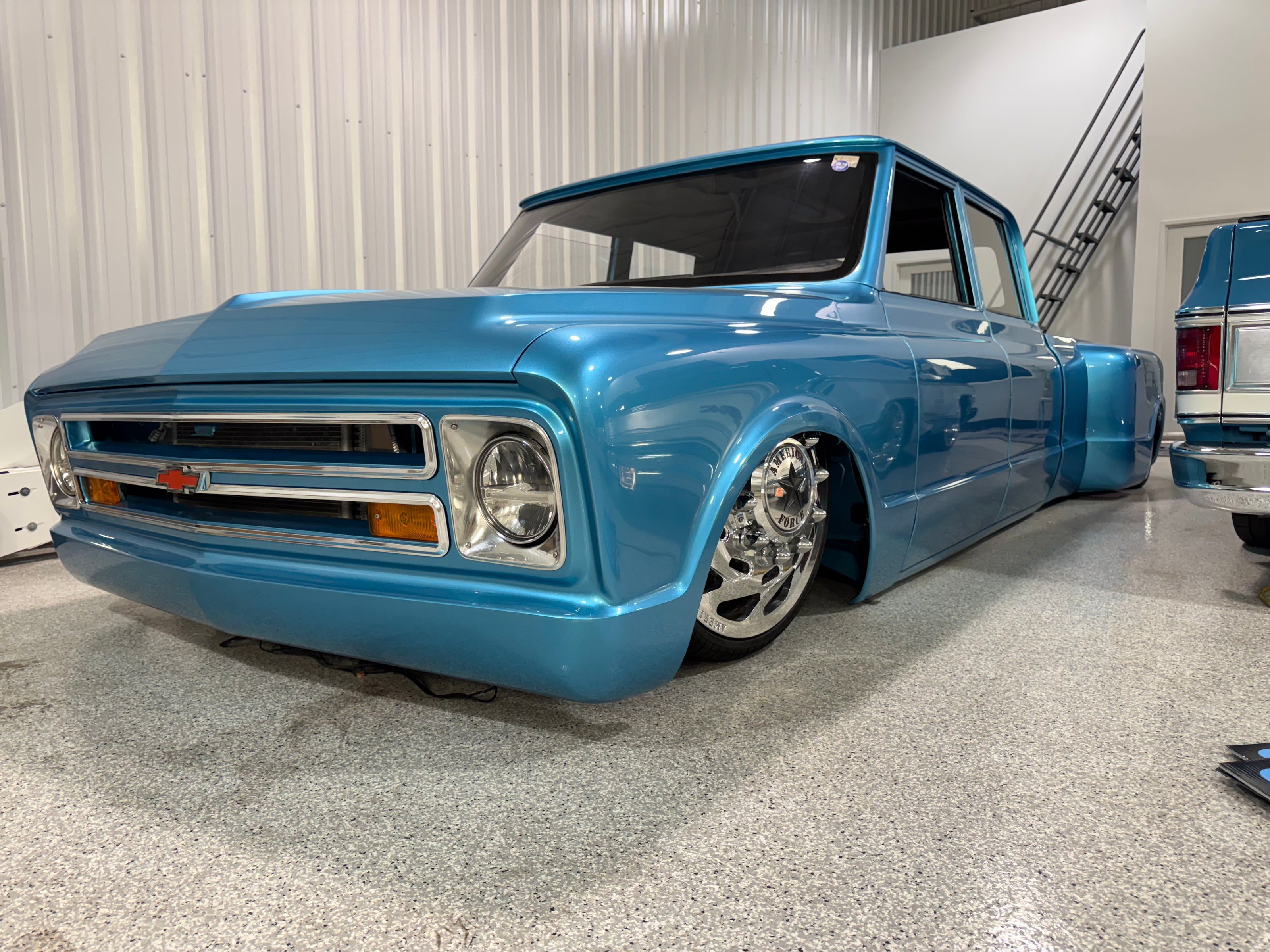 - Custom body with shaved doors, flush-fit glass, and hand-built dually fenders