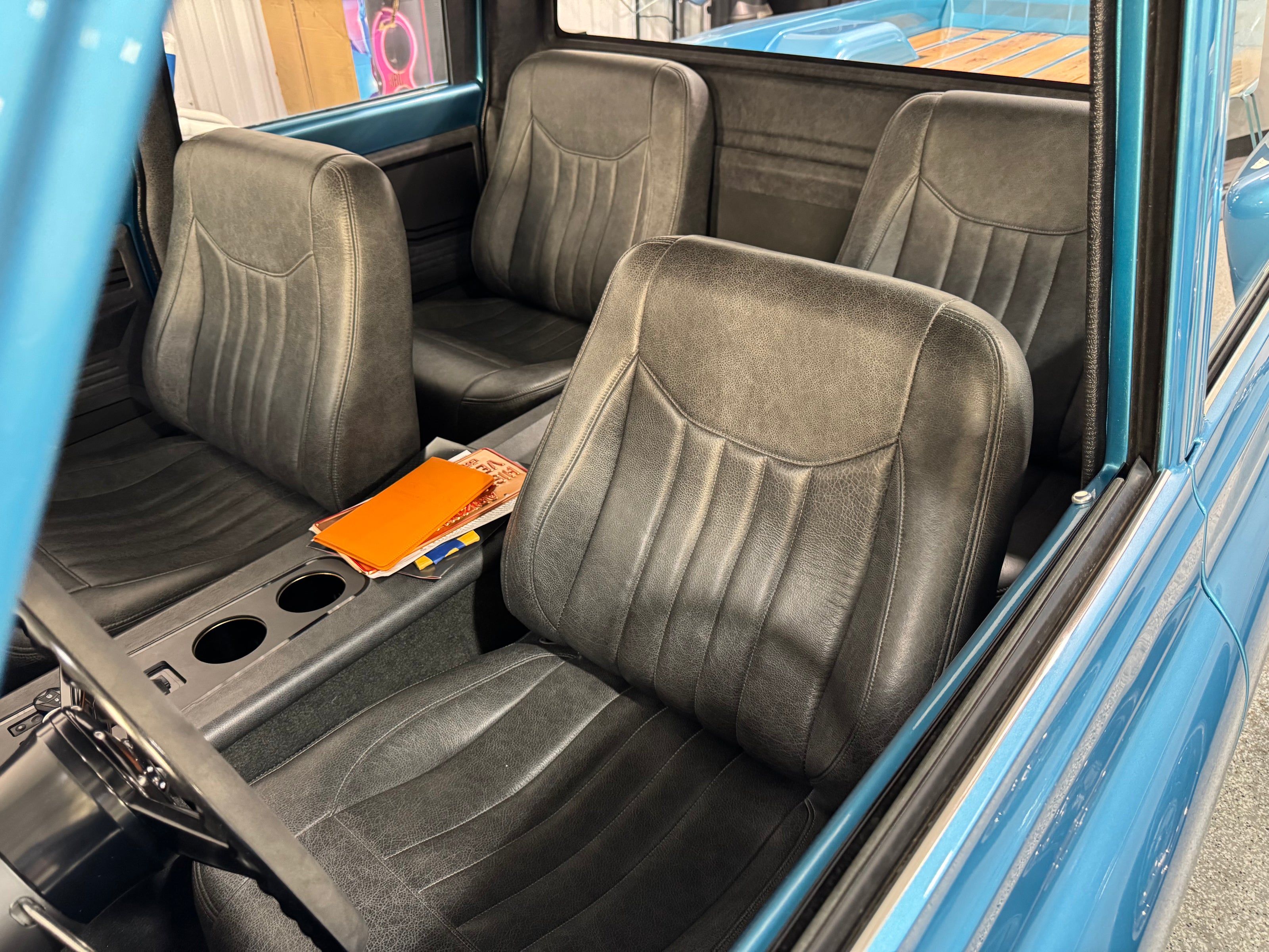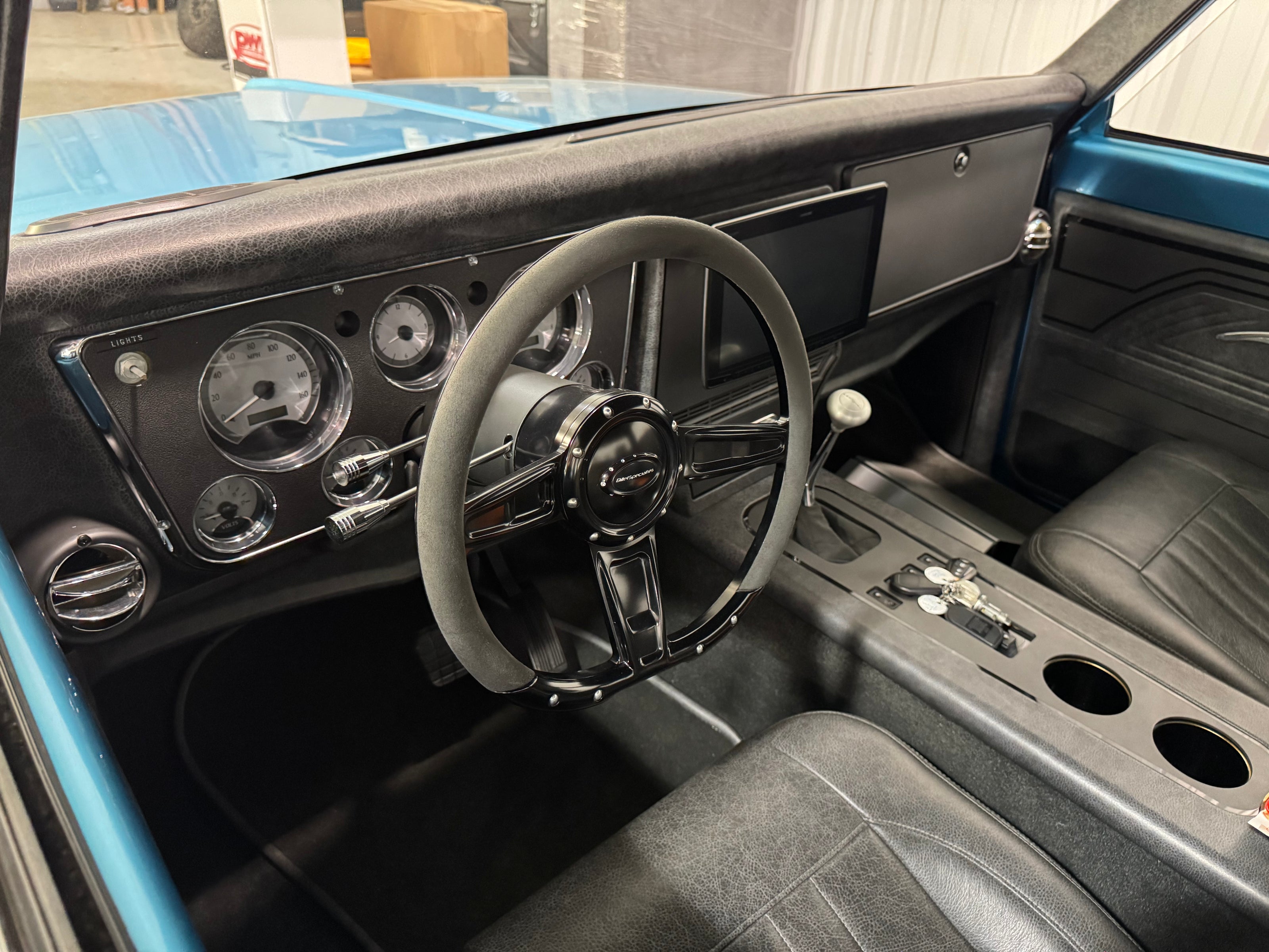 - Custom center console with air-ride controls, gauges, and vents